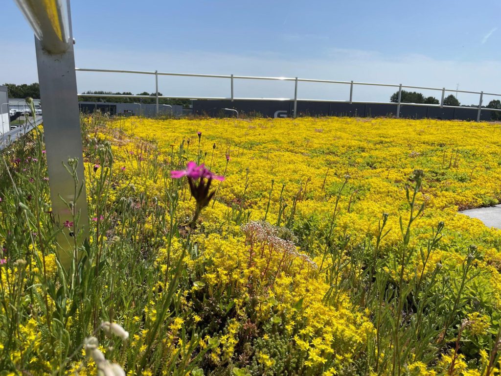 Meer insecten: Groene daken ondersteunen biodiversiteit door een nieuw thuis te bieden voor vogels, insecten en andere dieren, wat kan leiden tot een toename van de lokale biodiversiteit met tot 40%.